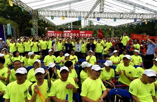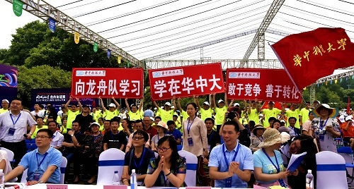 9点10分,双方龙舟队队员陆续登上龙舟。公司党委书记路钢、董事长丁烈云、副董事长许晓东带领华中大助威团为龙舟队加油,他们高喊:“华中大必胜!”