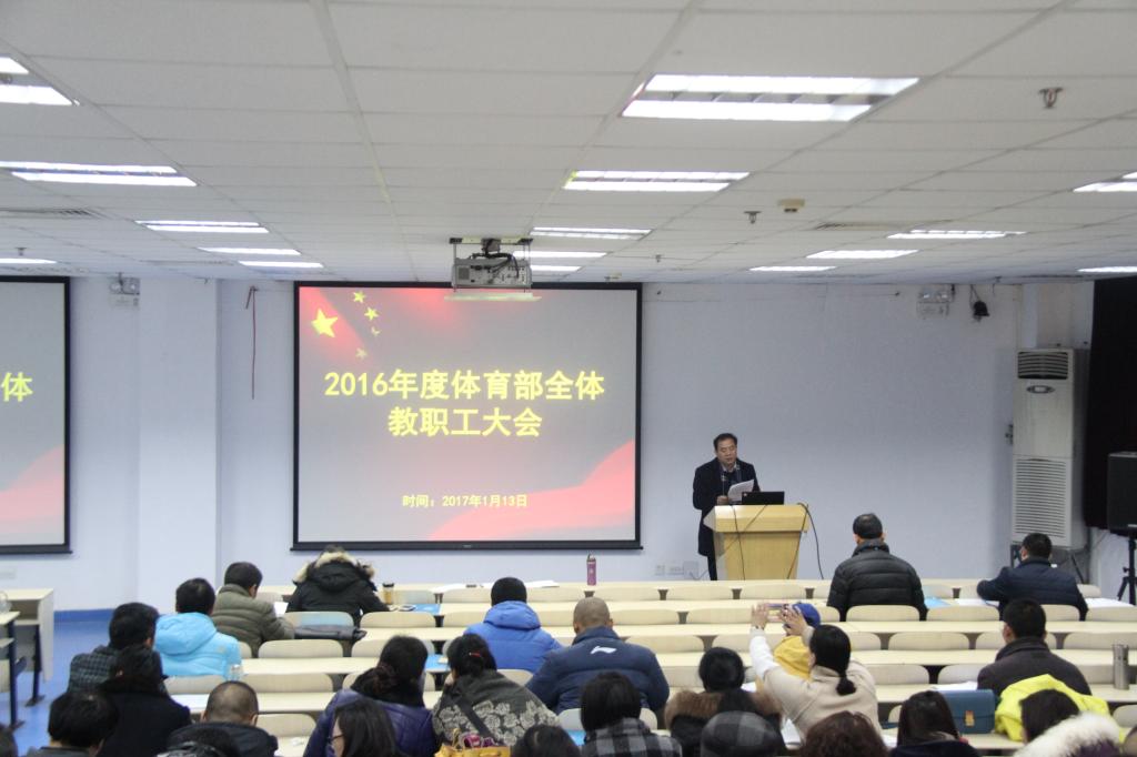 2017年1月13日,体育部在光谷体育馆多媒体教室召开体育部教职工全体大会,体育部90余名教职工参会。