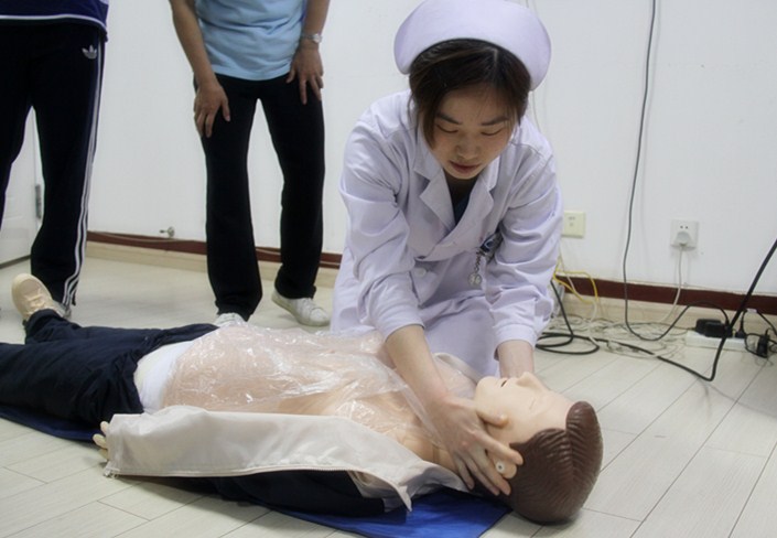 在对心肺复苏知识进行充分讲解后,校医院叶护士为大家演练了一遍专业的急救过程。“先要判断倒地人是晕厥还是昏迷,如果是昏迷就要开始心肺复苏了。”“心脏按压和人工呼吸的比例是按压30次,吹两口气。”魏春丽在旁边不断地指导纠正老师们的急救方法。
