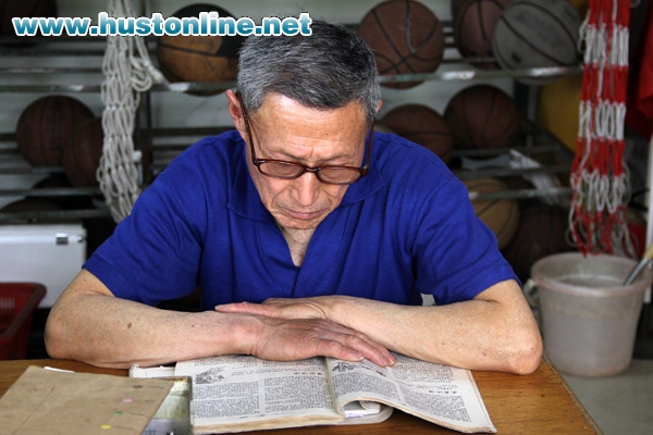 比较空闲的时候,老爷爷喜欢在器材室阅读书籍。