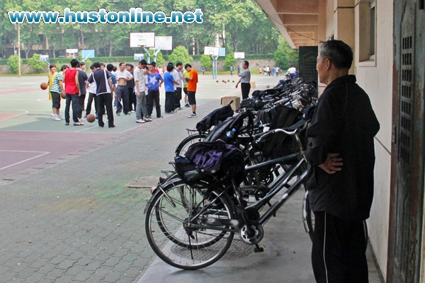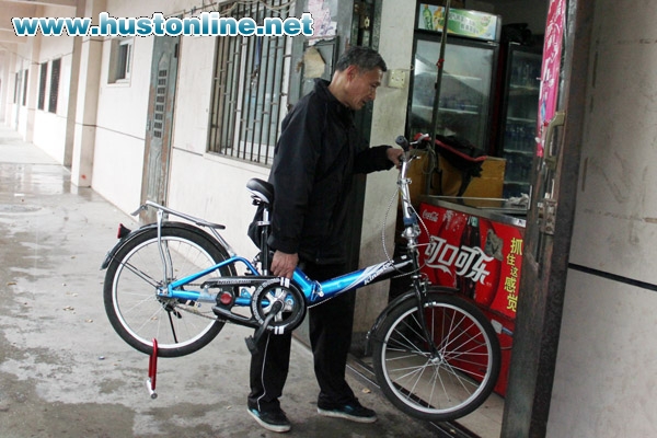 晚上锻炼后,很多人便随意将自行车停在篮球场旁,由于害怕丢失,老爷爷总是把自行车搬进器材室保存一晚。