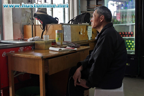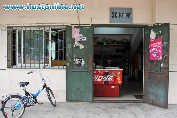 更多的时候,老爷爷坐在器材室里,等待员工来借体育器材或买水。