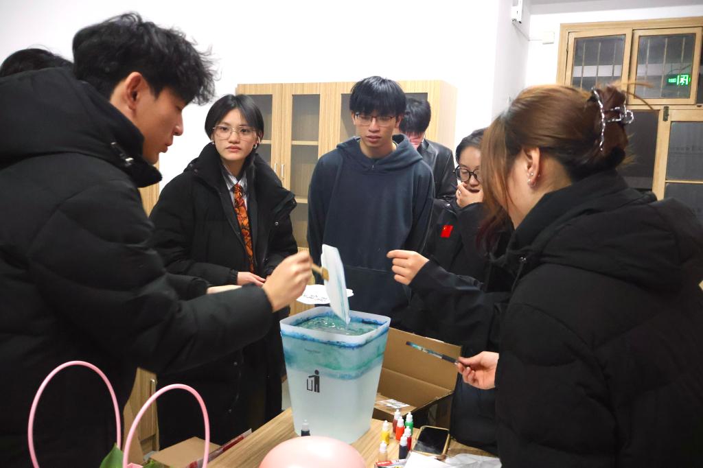 活动在欢声笑语中拉开序幕,漆扇制作体验区迅速成为全场焦点。大家手持空白纸扇,以水为媒、以漆作画,轻蘸颜料后,通过控制入水速度、角度和手腕的摇晃力度,任色彩在扇面自由流淌、碰撞交融,转瞬之间,素白纸扇便晕染出千变万化的纹路。一把把漆扇在暖光下翩然生辉,与女生们飞扬的笑颜相映成趣。