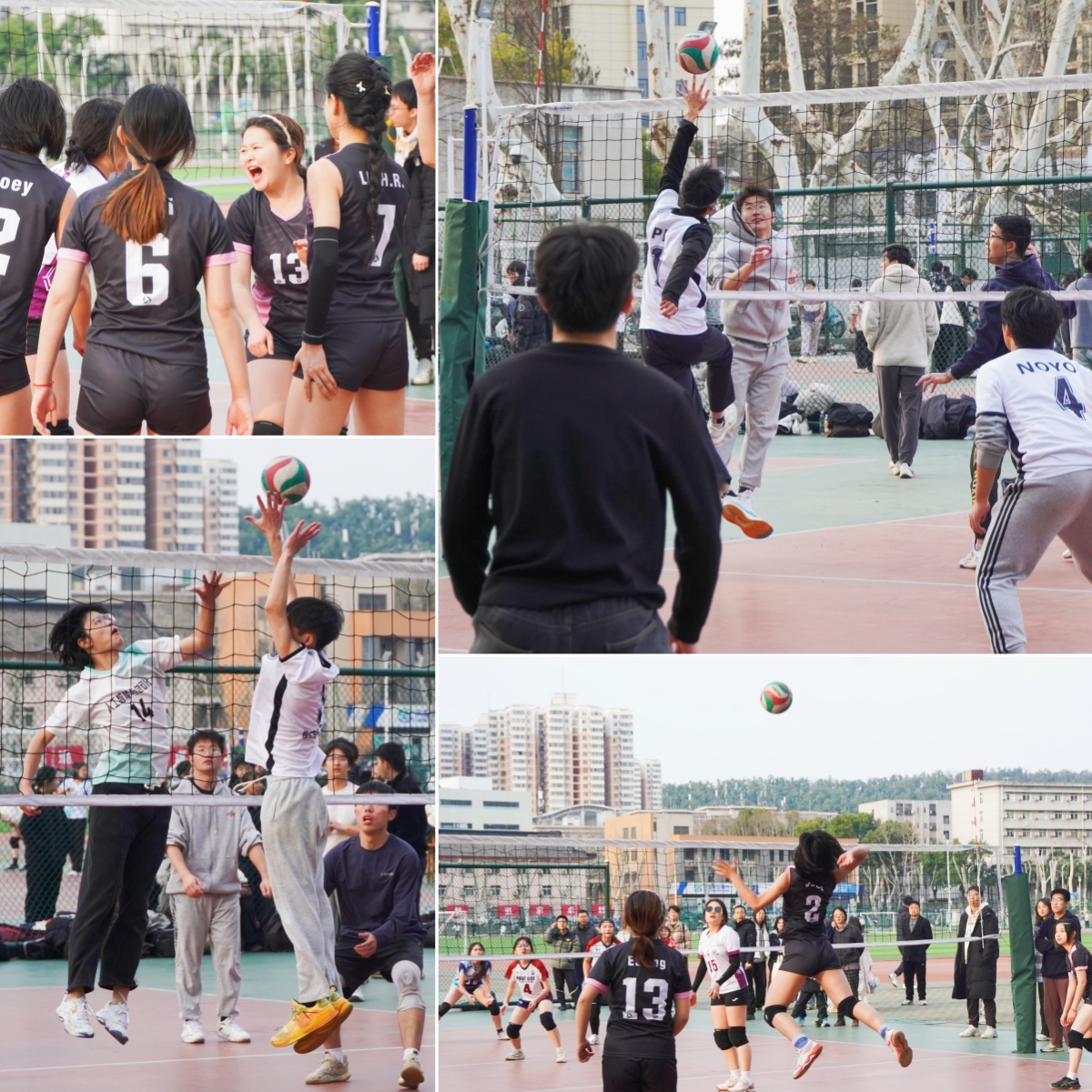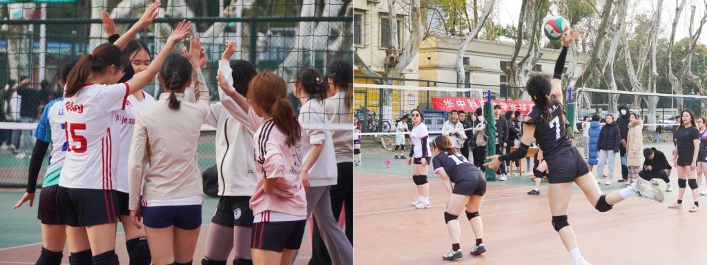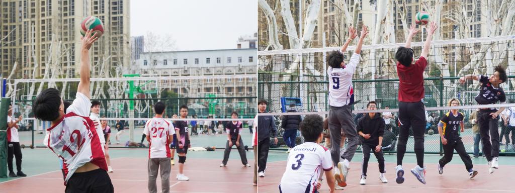 “好发!”“漂亮!”“好球!”“加油!”......首日比赛精彩纷呈,各队伍都展现出高昂的斗志和精湛的球技,场上队员们默契配合、奋力拼搏,时而高高跃起,奋力扣杀,时而迅速移动,精准拦网,充满了青春与力量的美感。场外,观众们热情洋溢,用呐喊声和掌声为各自院系的队伍加油助威,现场气氛热烈非凡。