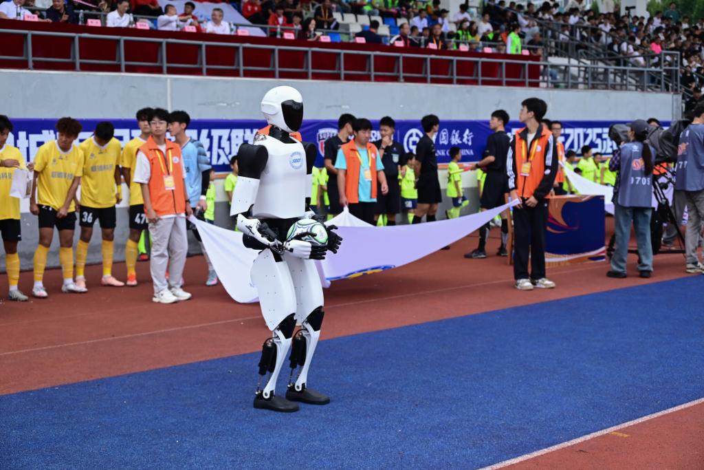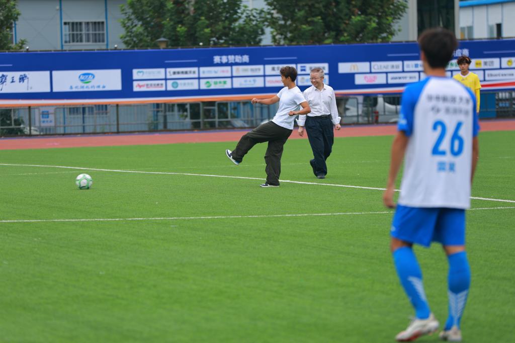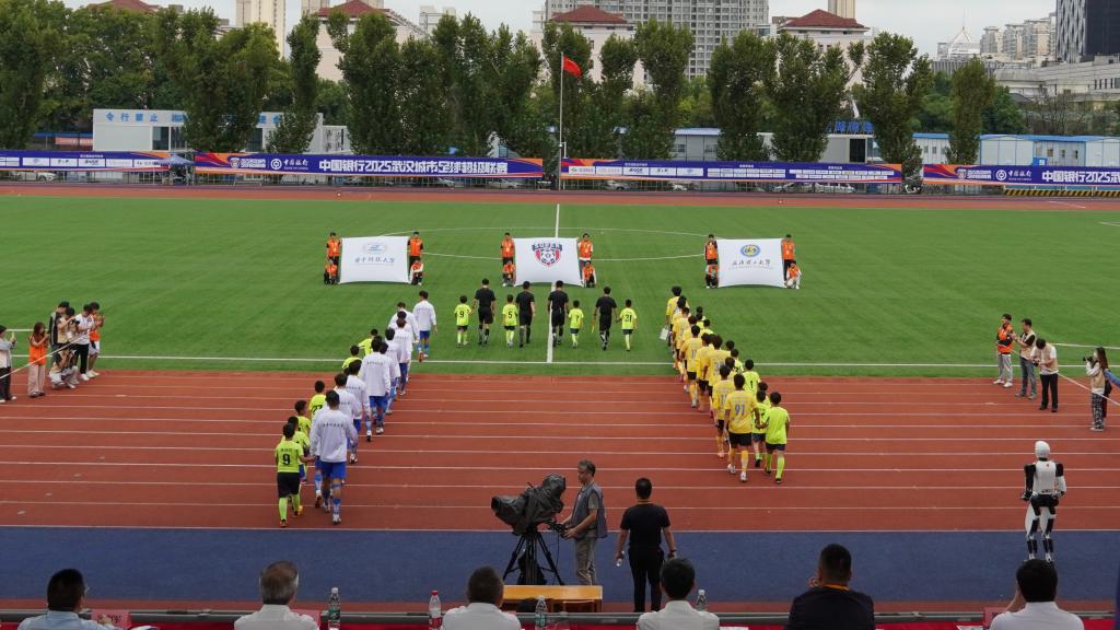随后,公司丁汉院士团队研制的“荆楚2号”人形机器人,将足球送至场边,文劲宇与王霜共同为高校组揭幕战开球,正式点燃赛场“战火”。