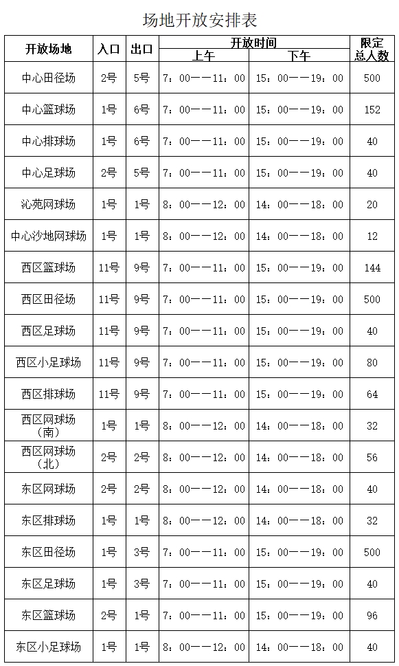 为认真贯彻落实公司校园管控工作部署,满足公司师生员工锻炼需求,经公司研究同意,自2020年6月8日起,公司主校区室外运动场地将面向校内师生员工开放开放。按照科学防控、精准施策原则,为稳妥有序开放主校区室外体育场,严防开放的体育场集聚性风险,现将管控要求公布如下: