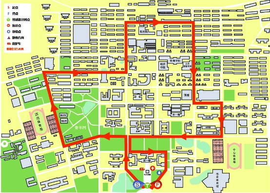线路说明:南一门——→西一路——→紫荆路——→西四路——→北一路——→西一路——→医院北路——→东二路——→红棉路——→东三路——→紫荆路——→西一路——→南六楼北侧道路——→终点。(5公里)。