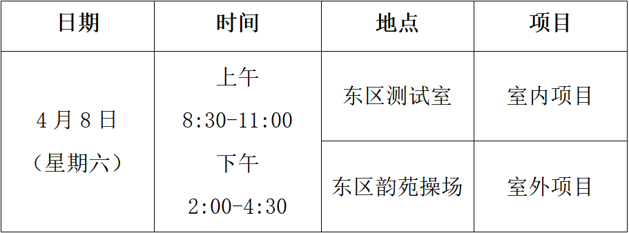 因天气原因部分院系未完成测试,同时鉴于部分员工未测、成绩缺项或不及格,bevictor伟德官网决定4月8日在东区操场增加一次测试,具体日程如下: