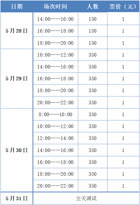 5月27日08:00开放试运行预约(试运行期间,可提前一天预约游泳场次),请有需要的师生员工认真阅读《游泳馆入馆须知》和《游泳馆预约及进场流程》,预约成功后按照场馆开放时间和相关流程有序进场。试运行开放时间安排见下表: