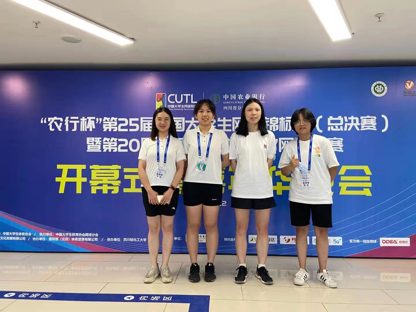 公司女子网球代表队由光电公司李雯易、陈赞宇,工程科学公司王琦玫,电气公司曹清泉组成。公司女团先后战胜澳门大学和同济大学代表队,以小组第一的成绩稳稳出线。淘汰赛中再破东南大学和中山大学代表队,其中公司队员陈赞宇表现可圈可点,面对强敌毫不畏惧,以快速进攻和稳定的发挥展现出了华中大运动员在赛场上的果敢和自信。再战昔日亚军五邑大学代表队,她们以“月亮球”打遍天下著称,但公司女团“任你千变万化,我自岿然不动”,成功破防与暨南大学会师决赛。暨南大学作为赛会一号种子,其球风以稳定多变著称,公司女团始终保持高水平的球感和球商,关键比分时理智冷静、见招拆招,虽最终惜败取得女子团体亚军,但以灵活的变化技战术和一颗“强大的心脏”得到了组委会和兄弟院校的认可。