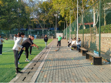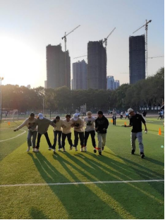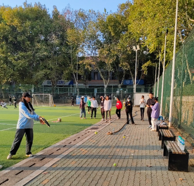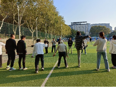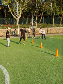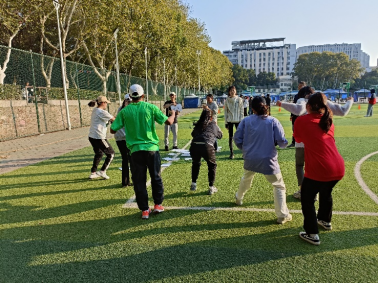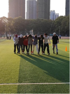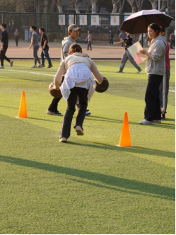 最后一个游戏是花样接力。“乒乓球→网球→篮球→多人多足”,项目一项接着一项,每一次失误都会影响最终的结果。同学们将自己平时不轻易展示的第二项运动技能显露出来,争分夺秒,力求零失误的完成整场比赛,像最终的胜利进发。