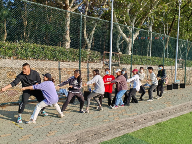 第一个游戏是:龙舟—拔河。作为体育活动中的传统项目,同学们分成两队鼓足干劲,斗志昂扬地向对面发起冲击,两队你争我夺,同学们齐声高喊口号“一、二、一、二”同心协力将绳子向后拉,团队精神像一根神奇的指挥棒,每一个步伐,每一个口号,是那么的一致、那么的整齐,最终白队拔得头筹。