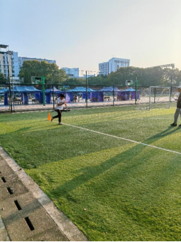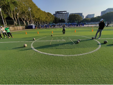 同学们一起参与的第二个游戏是:“足球冰壶”。足球的技巧搭配上冰壶的规则,考验着同学们的智慧与配合。大家集思广益,不断调整战术,一球接着一球,或攻击对方的足球将其踢走,或使我方的球停留在中心点。