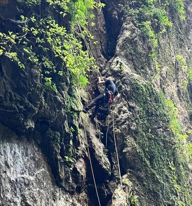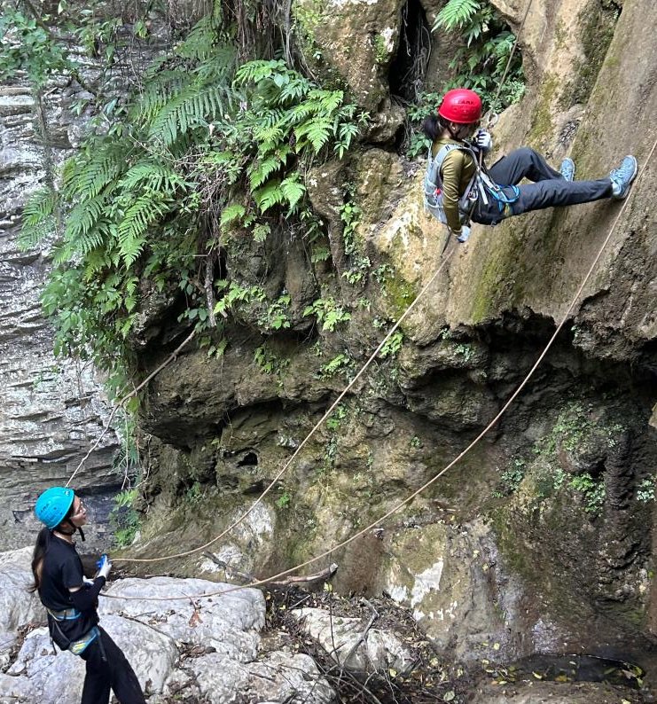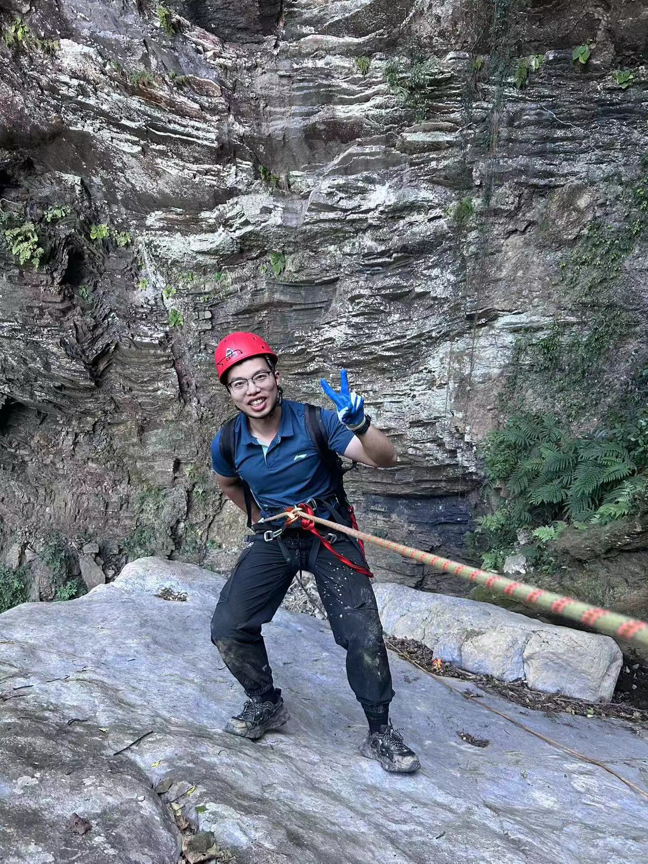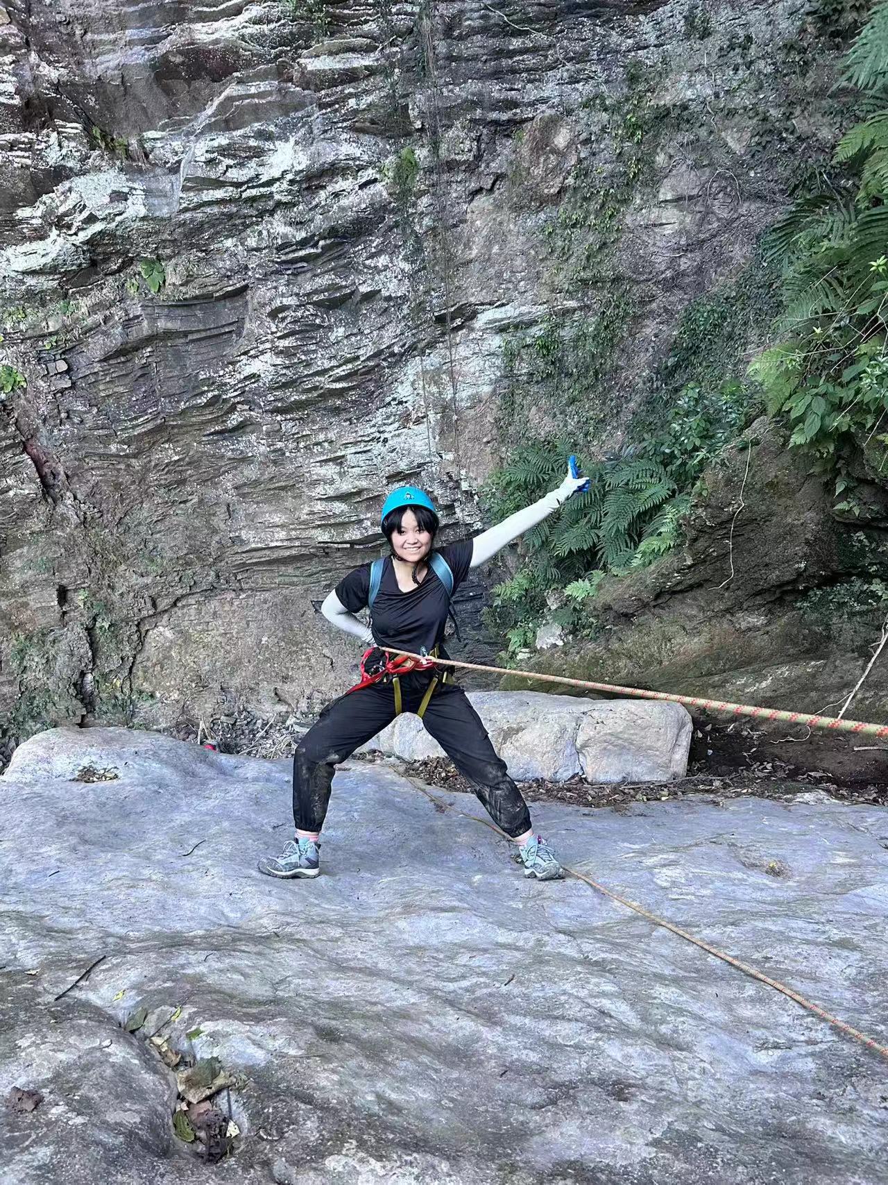 抵达崖顶后,岩降环节随之展开。在领队郑子未与向导战天的专业指导下,各项安全措施被一丝不苟地执行到位。面对陡峭的岩壁,同学之间相互鼓励,在克服心理恐惧的同时,按照所学技巧,有条不紊地展开岩降行动,最终,近20名团队成员凭借科学严谨的规划、不屈不挠的拼搏以及默契的团队配合,圆满出色、安全顺利的抵达崖底,完成了活动挑战。