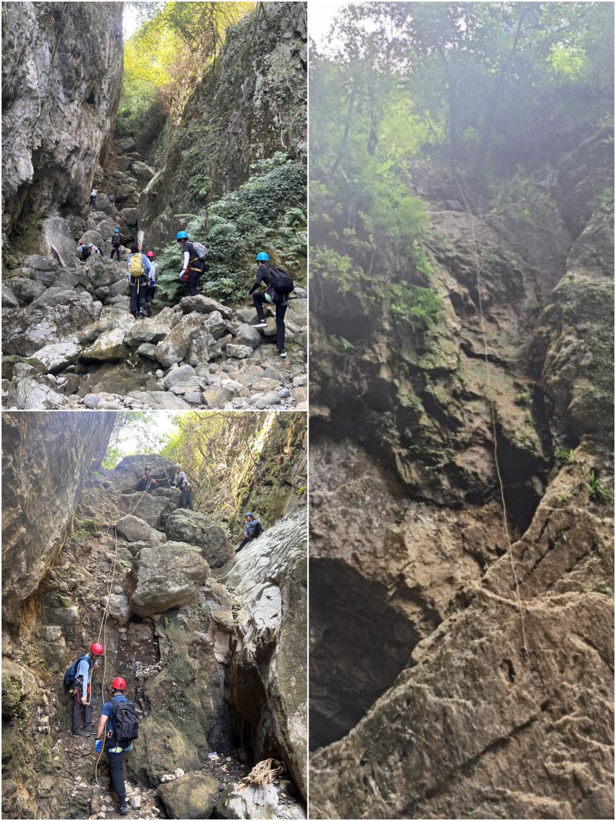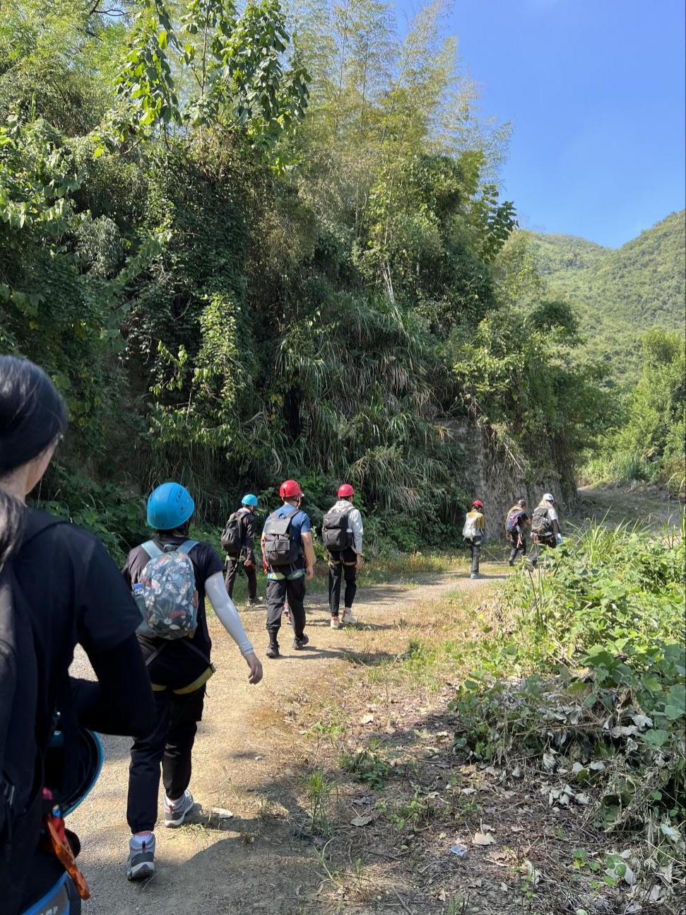 抵达毛铺峡谷后,同学们沿着崎岖山路逐步深入,一路欣赏着大自然的美景,感受着体力与意志的考验,一行人马攀爬过一块块岩石后,高耸的峭壁映入眼帘。