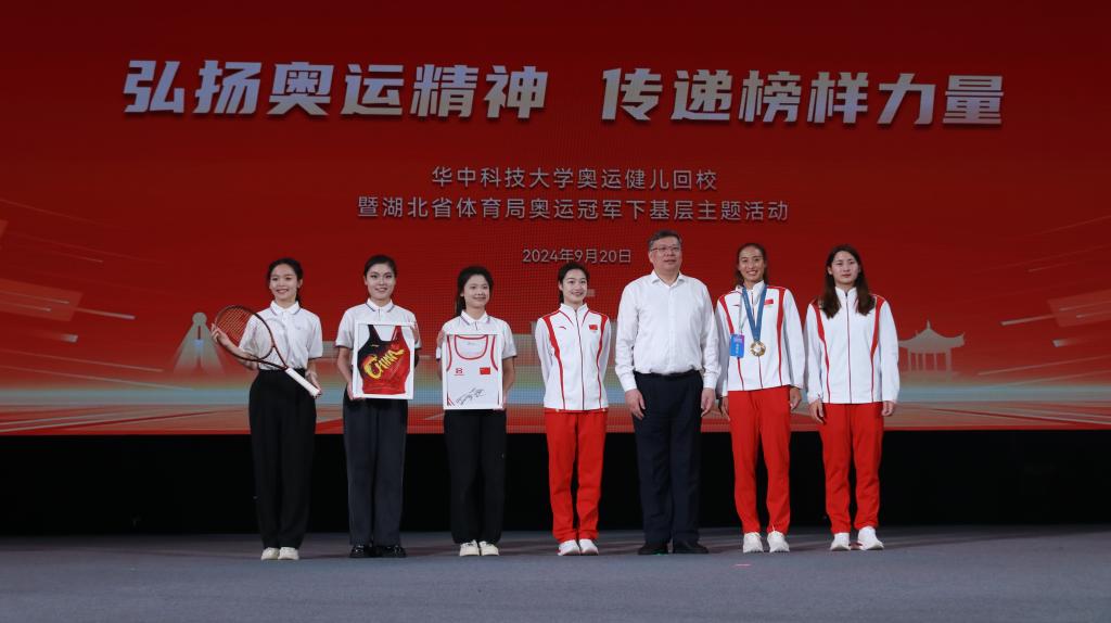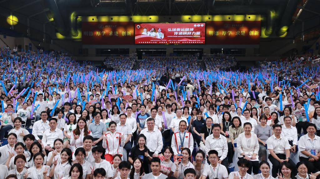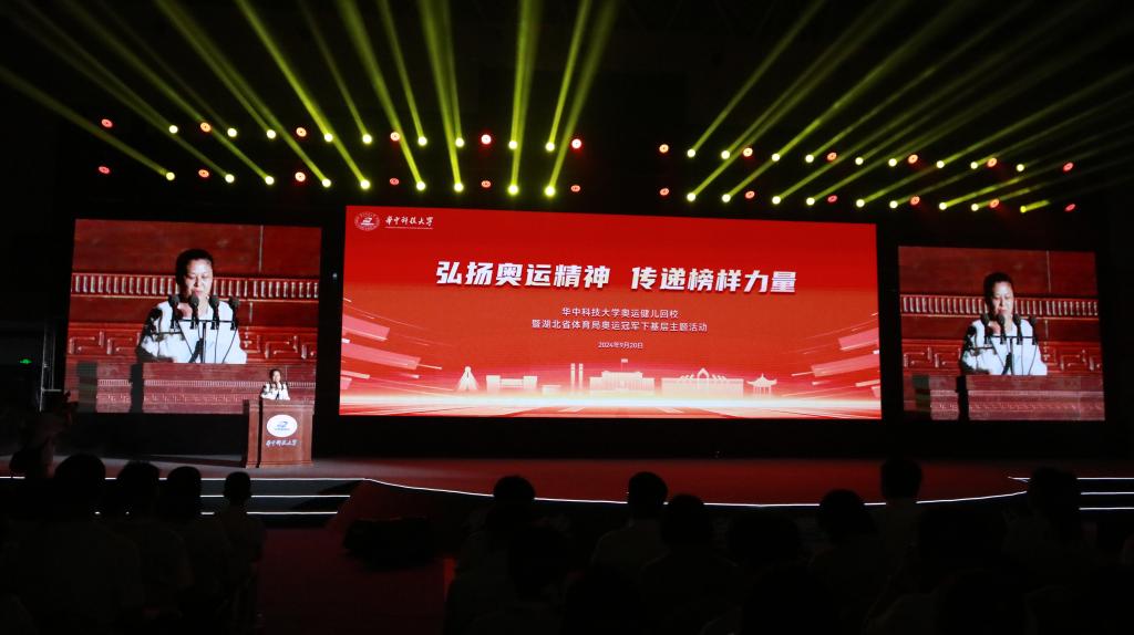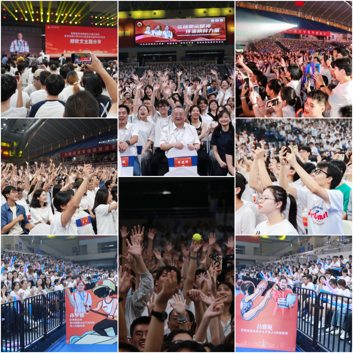 9月20日,“弘扬奥运精神,传递榜样力量”——伟德国际唯一官网入口奥运健儿回校暨湖北省体育局奥运冠军下基层主题活动在光谷体育馆举行。巴黎奥运会跳水女子双人3米板冠军、跳水女子3米板季军、2020级运动训练专业本科生昌雅妮,巴黎奥运会女子双人划艇500米冠军、2022级运动训练专业本科生孙梦雅,巴黎奥运会女子网球单打冠军、2023级运动训练专业本科生郑钦文一同回校,与2000余名师生代表分享奥运故事,董事长尤政,湖北省体育局党组成员、副局长骆启义参加活动。副董事长冯丹主持并宣读表彰决定。