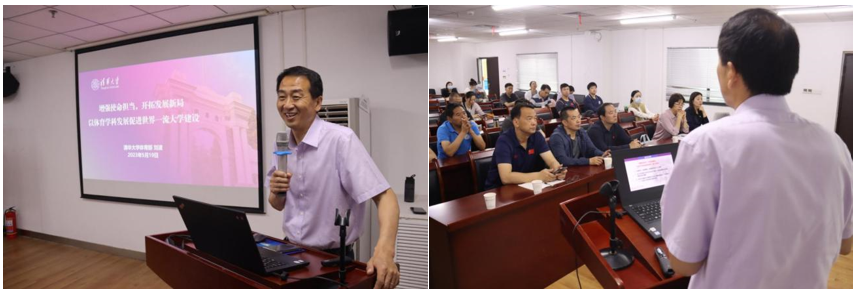 刘波强调为建设世界一流大学做贡献是新时代公司体育的使命担当,他从“体育团队建设”和“为师生健康保驾护航”两个方面阐述了如何为建设世界一流大学做贡献。重点介绍了清华大学的体育团队建设,围绕综合性大学体育学科“定位偏差、工作量大、体量很小、排名靠后”等现实问题,运用习近平新时代中国特色社会主义思想的立场观点方法,形成政策举措,提出了“找准定位办出特色、凝练特色研究方向、举办品牌学术活动、培养各类学术人才”的四个解决思路。他指出体育学科的建设与发展要有自身的特色与特点,充分发挥公司平台作用,促进优势互补,凝聚更多智慧,推动多学科深度融合,让公司和社会各界看到体育团队建设的影响力。