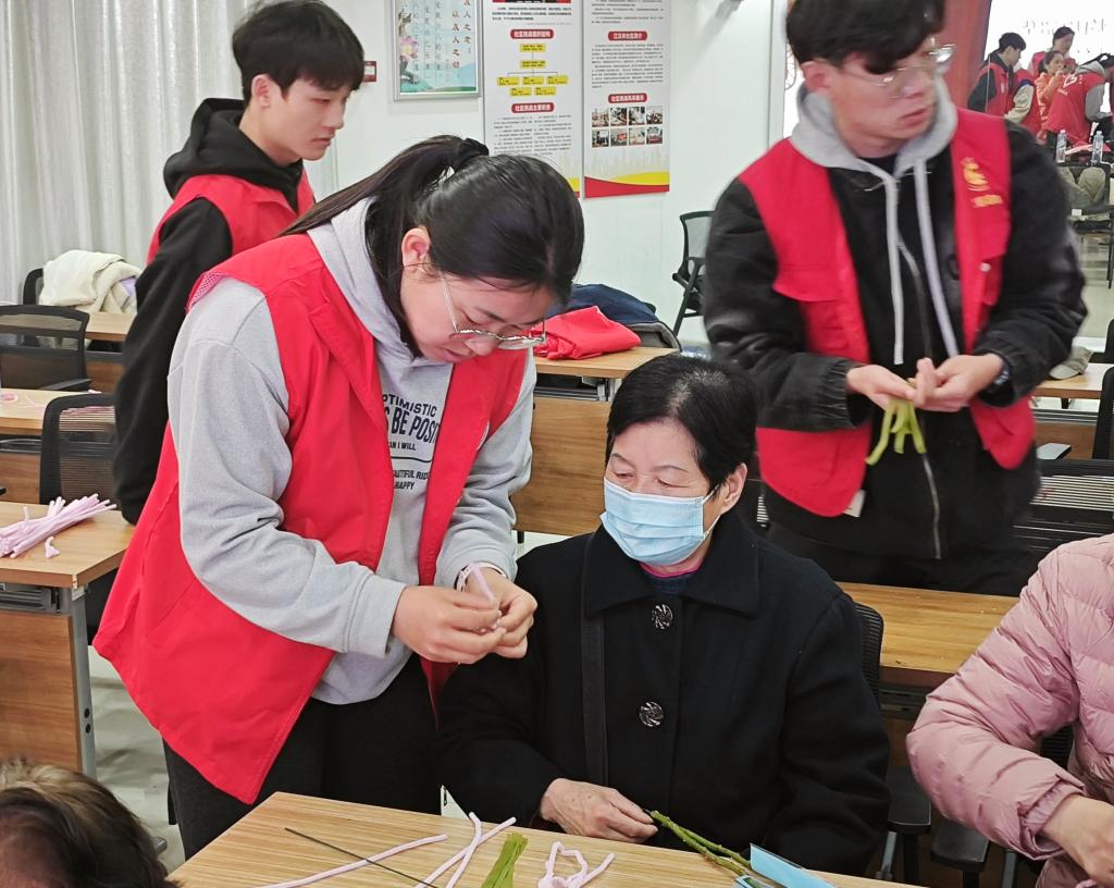 在江汉关社区党群服务中心,队员们帮助社区奶奶们一起编花,用手工劳动共庆三八妇女节。从材料分发到花朵的制作再到花束的编扎,队员们耐心细致,一点一点帮助奶奶们,用双手创造美丽,最后呈现出一捧捧美丽的花朵和一张张可亲的笑脸。