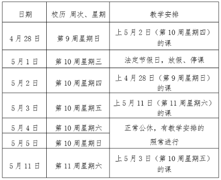 请各教学单位提前安排好劳动节期间的工作,确保教学秩序平稳有序。因特殊情况需调整教学安排的单位,应按规定办理相关手续。