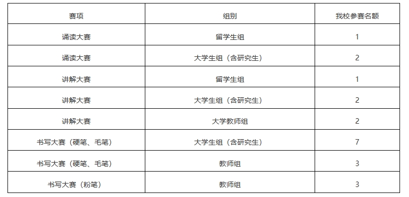 本届大赛分四个赛项:“诵读中国”经典诵读大赛(简称诵读大赛)、“诗教中国”诗词讲解大赛(简称讲解大赛)、“笔墨中国”汉字书写大赛(简称书写大赛)、“印记中国”师生篆刻大赛(简称篆刻大赛)。