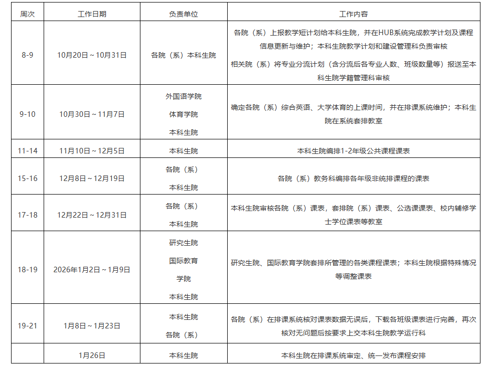 2025~2026学年度第二学期普通本科生课程表的编制工作定于2025年10月20日至2026年1月25日进行(校历第8周~第21周)。在编制本科课程表的过程中,请各院(系)及有关教学单位严格遵照以下各项规定: