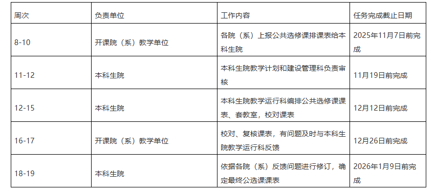 为进一步丰富公司素质教育基础选修课程(公共选修课程)资源,满足公司员工对公选课的需求,做好2025~2026学年度第二学期主校区素质教育基础选修课程(以下简称“公共选修课程”)课表编制工作,现将填报及排课事项通知如下: